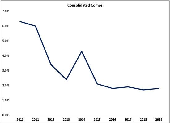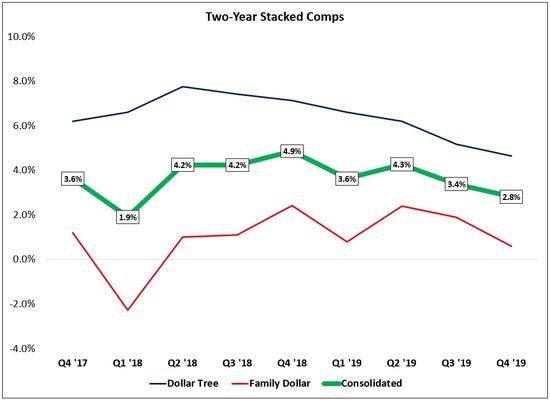 For the quarter, comparable store sales (comps) increased marginally (0.4%), with an increase of 1.5% at the Dollar Tree banner offset by an 0.8% decline at Family Dollar (note that they faced some headwinds in the quarter from a condensed holiday shopping season and the early release of SNAP benefits in the year-ago period). As shown below, consolidated comps in 2019 were comparable to what the company has reported in each of the prior three years – but well below what shareholders were accustomed to in the years before 2016.