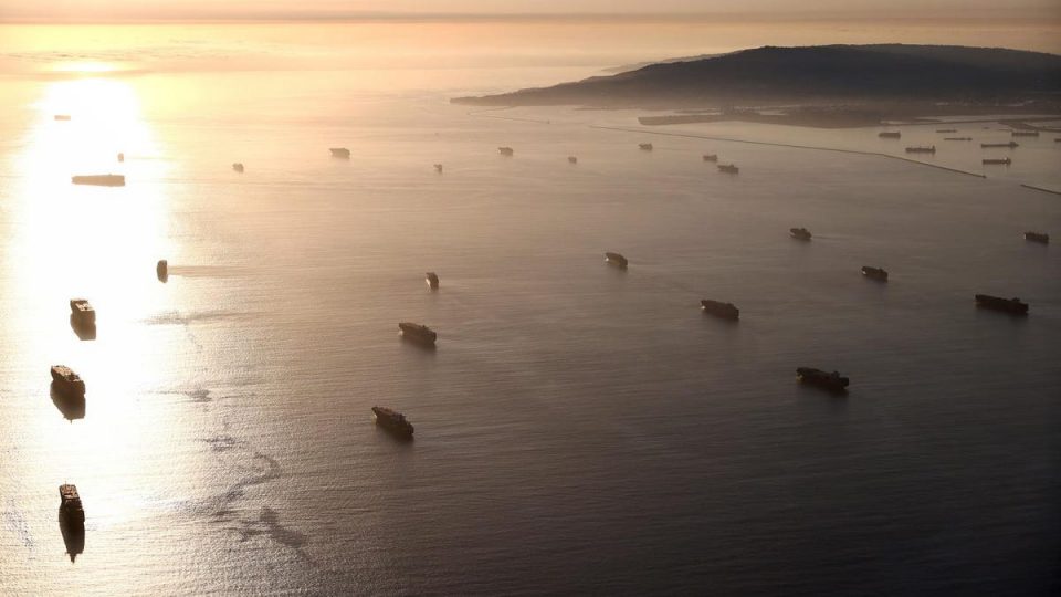 LOS ANGELES, CALIFORNIA Container ships anchored by the ports of Long Beach and Los Angeles