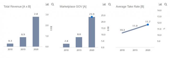 DoorDash primarily makes money by charging restaurants a commission based on the total dollar order value and also charges a fee to consumers for using its platform. The company also generates revenue from membership fees paid by consumers for its subscription service – DashPass and by charging per-order fees to merchants that use its logistics to service orders under its Drive third party program. DoorDash’s Gross Order Value – or the total value of orders placed on its marketplace – grew from around $2.8 billion in 2018 to $8 billion in 2019. We expect it to rise to about $24 billion in 2020, as Covid-19 caused orders made on the platform to surge almost 3x over the first nine months of the year. The company’s Total Revenue has grown from around $0.3 billion in 2018 to about $0.9 billion in 2019 and is likely to jump to about $2.8 billion this year.