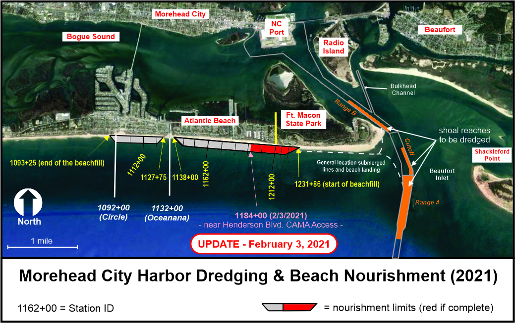 Beach nourishment progress map for the Morehead City Harbor maintenance dredging project as of Feb. 3. Image: Carteret County Shoreline Protection Office