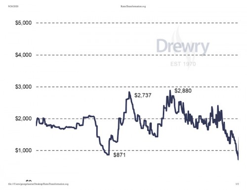 This week’s reading for the Drewry Hong Kong-Los Angeles spot freight rate benchmark ($/40ft container), the first spot rate index tracked in the container shipping industry, topped the previous record ($2,880 in 2012) by $1,201/40ft box, broke the $4,000 threshold and reached a 15-year high of $4,081 per 40ft container – more than double the long-term average price.