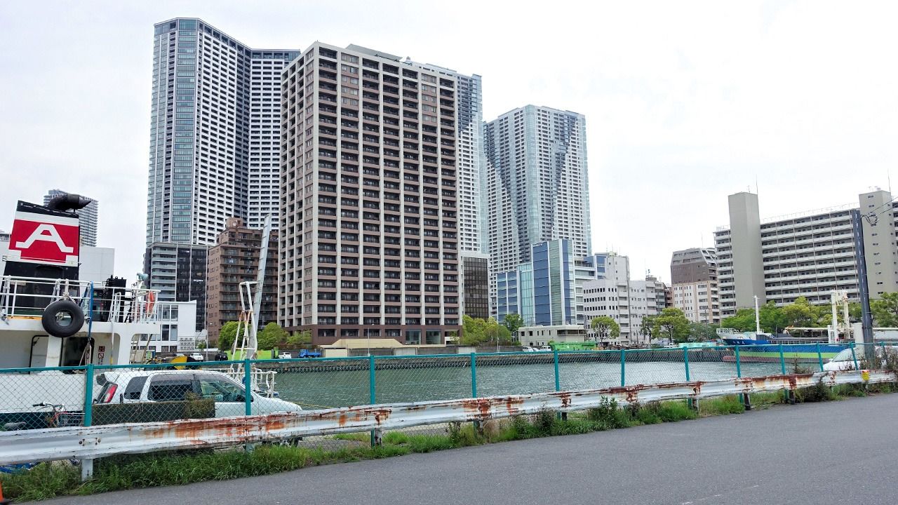 The shop is located roughly 600 meters from Kachidoki Station on the Toei Ōedo Line, down Kiyosumi Avenue toward Tsukishima. Just past the Tsukishima Police Station, at an intersection flanked on both sides by high-rise condos, I see a fluttering banner with the characters Toyosu chokusō (Direct from Toyosu). A guide gestures for me to turn right down the Toyomi Wharf to a large refrigerated warehouse.