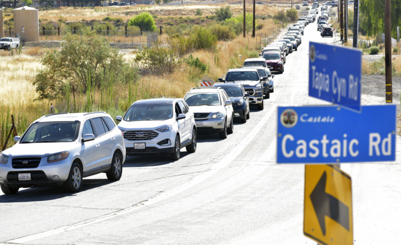 Cars lined up for at least a mile along Castaic Road Wednesday, as families waited to pick up boxes of fresh produce, dry goods and dairy at a food giveaway hosted by L.A. County Supervisor Kathryn Barger, whose 5th District includes the Santa Clarita Valley.