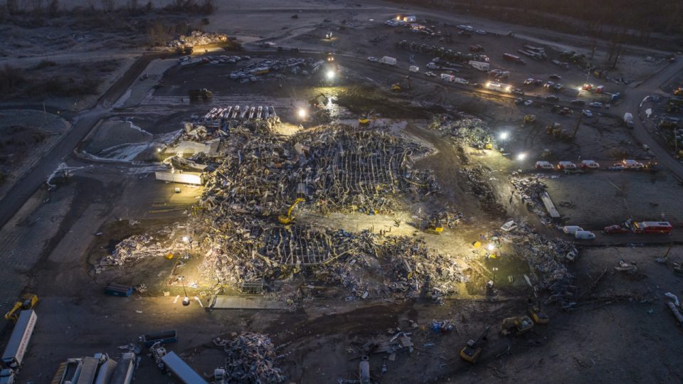 Search are rescue crews work at the Mayfield Consumer Products candle factory early Sunday, Dec. 12, 2021. A tornado traveled through the region Friday night.