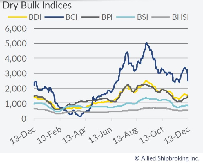 Thomas Chasapis, Research Analyst with Allied said that “I can say with certainty, that in absolute terms, a straightforward answer would be difficult to give. What most would utter is “it depends…” Seeking for a silver lining there is no better place to start than the “impressive” Capesize market. Looking at the BCI-5TC figure, if nothing dramatically changes, we will probably have its highest annual figure since at least the past five years. However, the point to stick to the most is the robust 2nd half, with the market almost (a few exceptions here and there were seen) holding above the 20,000 $US/day. Moreover, it is evident that the once considered “overpriced” FFAs back in late September, were actually “in-the-money”.