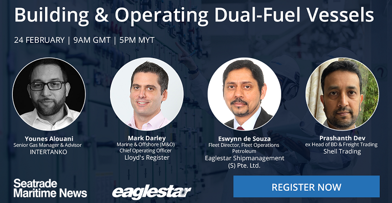 Issues around dual-fuel operations will be discussed in-depth at a forthcoming webinar entitled “Building and Operating Dual-Fuel Vessels” presented by Seatrade Maritime News, and hosted by Eaglestar.