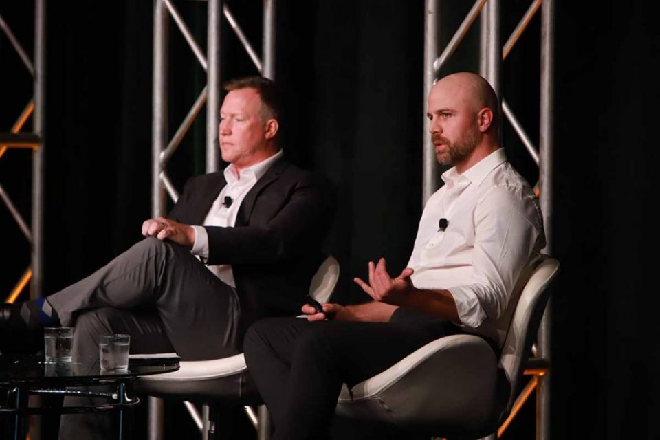 A session at the E-Scrap Conference featured evTerra’s Jeff Gloyd, left, and Chris Kaasmann of GreenChip. | Big Wave Productions/Resource Recycling, Inc.