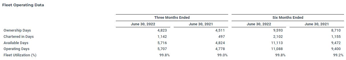 Charter hire expenses for the three months ended June 30, 2022 were $21.3 million compared to $6.2 million in the comparable quarter in 2021. The increase in charter hire expenses was principally due to an increase in chartered-in days as the Company took delivery of its fifth long term chartered-in vessel during the second quarter, and an increase in charter hire rates due to improvement in the charter hire market. The total chartered-in days for the three months ended June 30, 2022 were 1,142 compared to 497 for the comparable quarter in the prior year. The Company currently charters in five Ultramax vessels on a long-term basis as of the charter-in commencement date, with options to extend the charter period.
