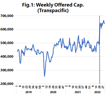 Released data shows the sharpest surge occurring in week 22, with offered capacity increasing from 535,200 TEU to 646,500 TEU in week 22 and expected to remain unaffected through week 31.