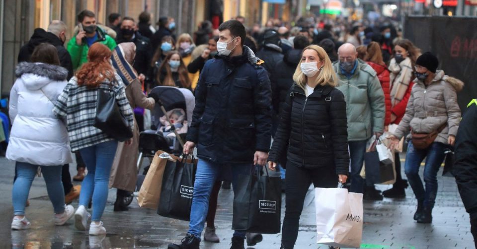 Christmas shoppers wear masks and fill Cologne’s main shopping street Hohe Strasse (High Street) during the coronavirus disease (COVID-19) pandemic in Cologne, Germany, December 12, 2020. REUTERS/Wolfgang Rattay/File Photo