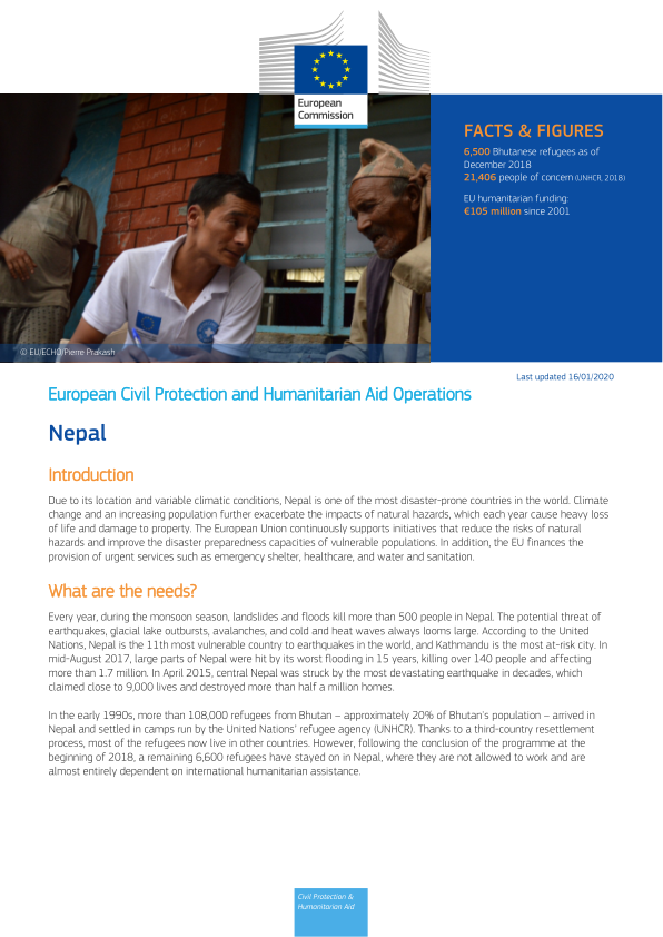During Nepal’s internal conflict, and up until 2011, EU humanitarian actions totalling €35 million supported thousands of conflict-affected people, especially in rural areas, by providing healthcare in addition to water and sanitation facilities. The EU also assisted refugees from Bhutan for more than 10 years until 2015. Since 2001, the total aid funding to Nepal exceeds €104 million, including more than €27 million allocated to disaster preparedness and risk reduction activities.
