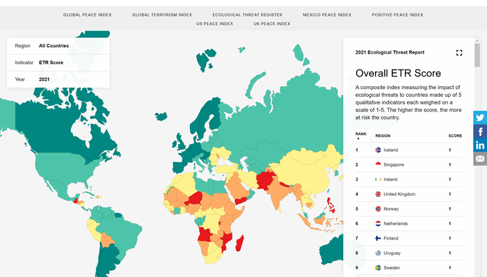 This is the second edition of the Ecological Threat Report (ETR), which analyses 178 independent states and territories. Produced by the Institute for Economics and Peace (IEP), the report covers over 2,500 sub- national administrative units or 99.9% of the world’s population.