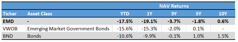 First, is the fact that the fund focuses on emerging market bonds. Emerging markets are significantly riskier than U.S. markets, as their economies, corporations, and governance standards are weaker. Recessions and downturns are more common in emerging market, as are defaults. Importantly, investors are well aware of these facts, and so tend to sell emerging market securities, including bonds, when times are tough, leading to lower prices and capital losses.