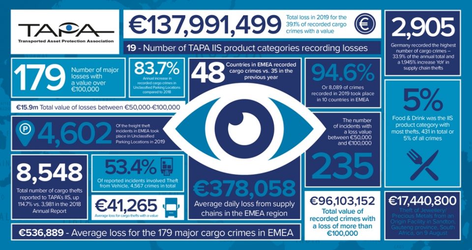Cargo thefts from supply chains in Europe, the Middle East and Africa (EMEA) more than doubled to 8,548 incidents in 2019 and involved losses of product worth well over €137m, according to the Transported Asset Protection Association (TAPA).