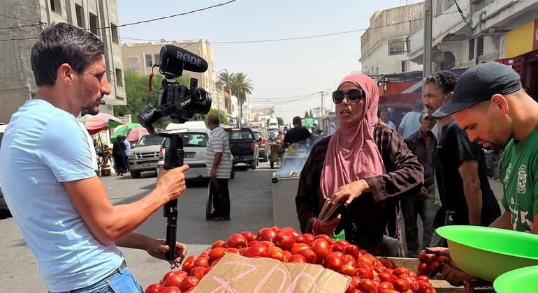 Tabouna bread maker Najwa Selmi demonstrates how traditional ‘tabouna’ is made at home in Kairouan, Tunisia, with a UNTV film crew looking on.