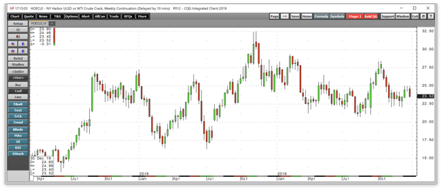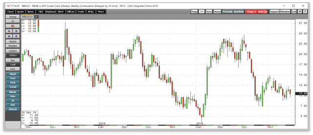 The price action in crack or refining spreads shows that gasoline and distillate fuel processing margins moved lower during the final quarter of 2019.