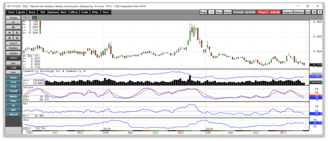 Natural gas was a wild ride in Q4 2018 as the price traded to a high at $4.929 per MMBtu in mid-November and then fell like a stone reaching a low at $2.543 per MMBtu in mid-February 2019. Natural gas rallied at the beginning of the peak season of demand late last year on the lowest level of inventories in years, but the price came back down to earth in December and during the first three months of 2019. During the third quarter, the selling continued taking the price to a low at $2.029 per MMBtu in August. In Q4, high levels of inventories stifled any chance of a peak demand season rally.
