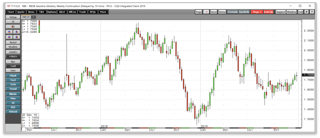 As the weekly chart highlights, gasoline traded in a range of $1.3230 per gallon to $2.1559 on the active month contract on the NYMEX in 2019. The price pattern on the weekly chart since early 2016 had been positive as gasoline has made higher lows and higher highs. However, seven consecutive weeks of losses ended that bullish price trend in Q4 2018. In Q1, eight straight weeks of gains sent the price back to the highest level since last October. The price of gasoline futures moved steadily lower with crude oil after hitting a high during the week of April 22. The fuel traded in a range since late September. Nearby futures closed on December 31, at $1.69050 per gallon wholesale. Gasoline spiked higher with crude oil on September 16 to $1.7785, but the price settled into a trading range over the rest of the year.