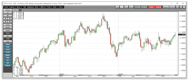 The weekly heating oil chart shows a constructive and bullish trend since early 2016. The price carnage in the crude oil market took the price to a low at $1.6424 per gallon in late December 2018 on the continuous contract before recovering with the price of oil.
