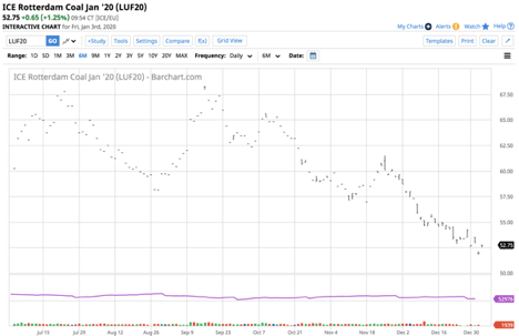 As the chart of the price of January coal futures for delivery in Rotterdam, the Netherlands shows, closed Q3 at $63.45 per ton and moved lower to $53.00 at the end of Q4, a decline of 16.5% in Q4 on the January contract. The price of Rotterdam coal futures underperformed both crude oil and natural gas in Q4, as coal has become a four-letter word for environmentalists in the energy sector.