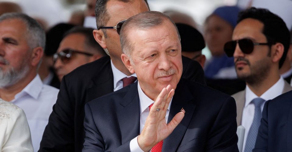 Turkish President Tayyip Erdogan waves to people during the opening of a mosque in Sisak, Croatia, September 8, 2022. REUTERS/Antonio Bronic