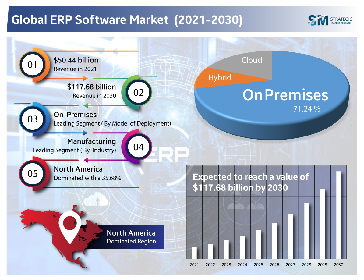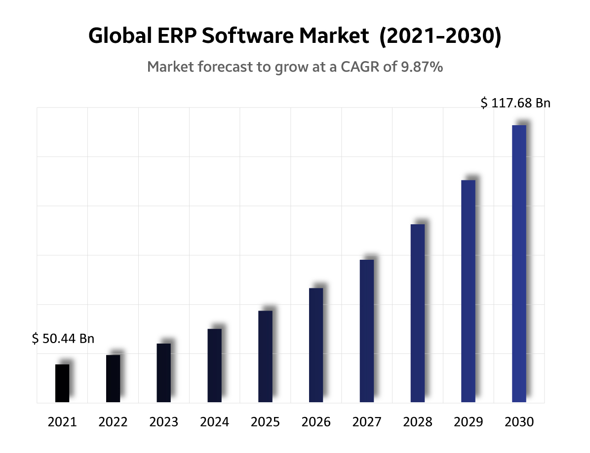 New York, USA, Sept. 09, 2022 (GLOBE NEWSWIRE) — The Worldwide ERP Software Market’s worth was USD 50.45 Billion in 2021 and will surpass USD 117.69 Billion by 2030 with 9.88% CAGR. ERP/ enterprise resource planning software is used by enterprises to manage their routine business operations like project management, compliance and risk management, supply chain management, etc. ERP software also aids in planning, budgeting, forecasting, and reporting an organization’s financial results. The rising need for supplier-relationship management and customer-relationship management, due to a steep surge in the number of businesses worldwide and the requirement for cloud-based ERP platforms, is augmenting the market’s growth rate.