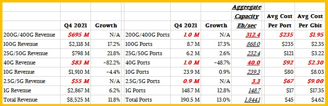 What we are always interested in when we see this raw data for each quarter is how the aggregate capacity shipped is changing and how the cost per bit moved is changing in switches, and we do a lot of spreadsheet magic to try to figure this out. Here is our best guess of what the fourth quarter for Ethernet switching looked like across different speeds: