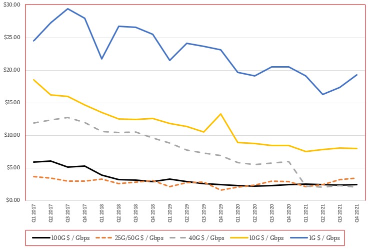 The table we have created shows the cost per Gb/sec of bandwidth, which is the driving metric for the hyperscalers, cloud builders, HPC centers, and large enterprises of the world. And indeed, as you can see, the cost per port on the fatter switches is higher, but the cost per bit is lower. And here is the trend data for port costs per bit over time from the historical information that we have gathered from IDC’s public data: