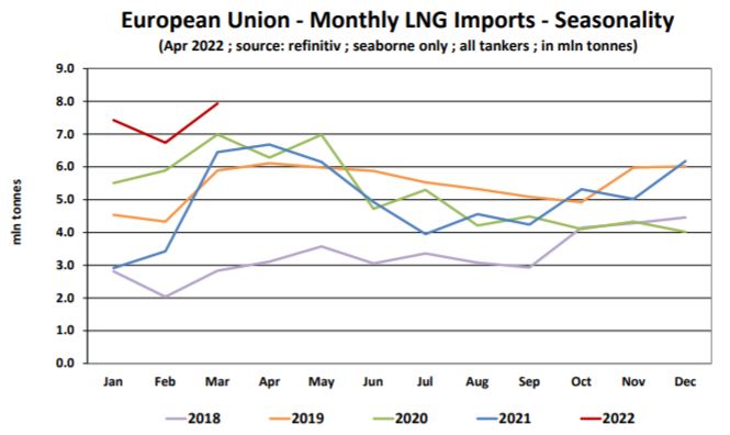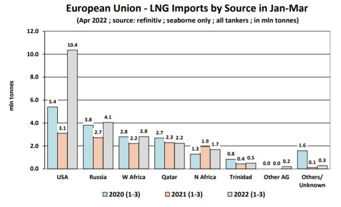Meanwhile, “despite all the talk of sanctions, volumes from Russia have not declined, far from it. In 1Q 2022, the EU imported 4.1 mln tonnes of LNG from Russia, up by +49.1% y-o-y compared to 2.7 mln tonnes in 1Q 2021. This was an all time record. The EU has never imported as much LNG from Russia as this year. In fact, March 2022 was an all time record month for Russian LNG imports into the EU. In March 2022, the EU imported 1.6 mln tonnes of LNG from Russia, up +14.5% m-o-m from February 2022, and up +34.3% y-o-y from March 2021. In 1Q 2022, Russia accounted for 18.3% of the EU’s seaborne LNG imports. West Africa is now in third place amongst top suppliers to Europe, shipping 2.8 mln tonnes to the EU in Jan-Mar 2022, up +27.0% y-o-y. West Africa accounts for 12.7% of EU’s LNG imports. Imports from Qatar, on the other hand, have continued to decline. In 1Q 2022, the EU imported 2.2 mln t of LNG from Qatar, down -2.0% yo-y from 2.3 mln t in 1Q 2021. Qatar accounts for 10.1% of the EU’s total seaborne LNG imports. Shipments from North Africa to the EU also declined by -13.5% y-o-y to 1.7 mln t in 1Q 2022, from a record high 1.9 mln t in 1Q 2021”, the shipbroker concluded.