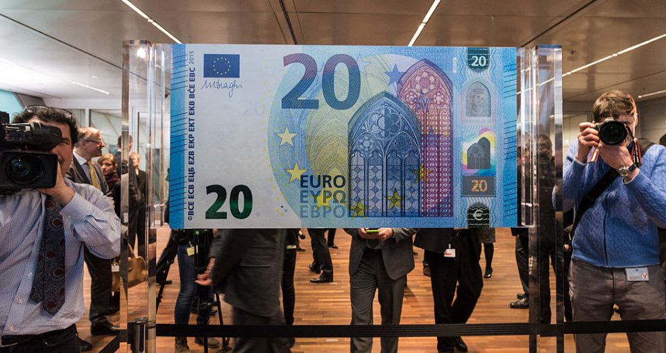 Guests and journalists observe a facsimile of the twenty euros banknote of Europa series at the end of its unveiling ceremony during which ECB president Mario Draghi signed a facsimile, in the ECB headquarters, Frankfurt, Germany, 24 February 2015.