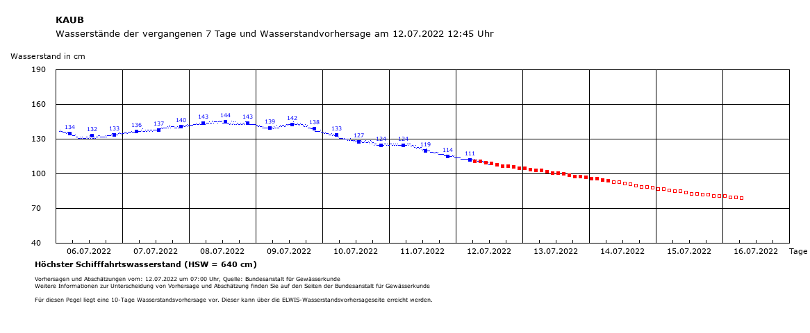 Water levels at Kaub are expected to fall close to 100cm before the end of the day, according to WSV forecasts, dwindling further to 96cm by Wednesday night, and to 78cm by the morning of 16 July. More normal water levels would be around 200cm.