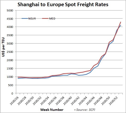 In the last 10 weeks of 2020, box freight rates from Asia to Europe nearly quadrupled to in excess of $4,000 per teu.