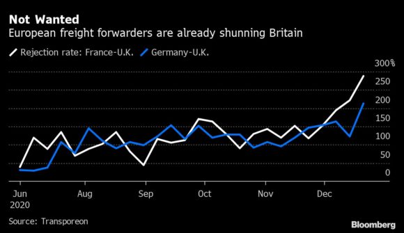 The rejection rate for cargo from France to Britain almost tripled last week — compared to the third-quarter average — and doubled for the Germany-Britain route as demand for transport fell 68% for France-Britain and 71% for Germany-Britain.