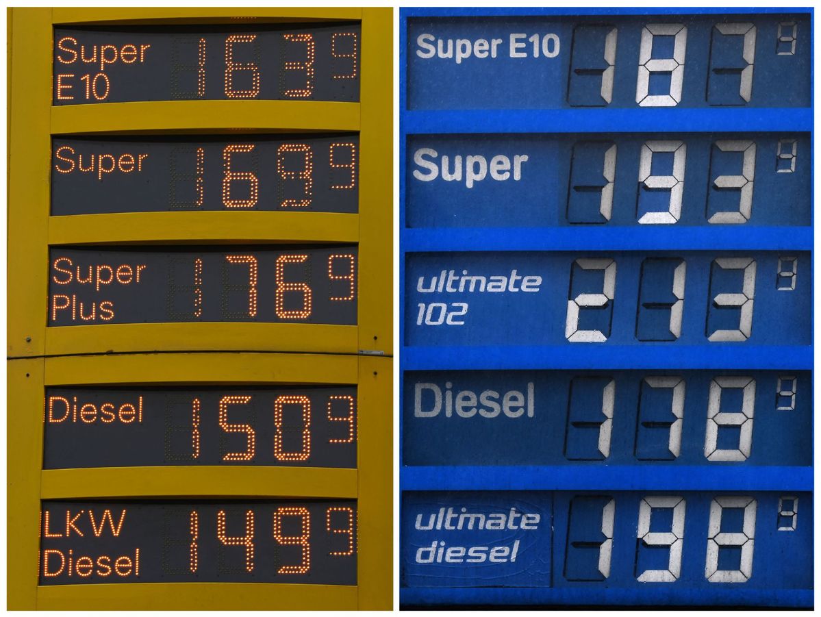 This combination of pictures created on Oct 14, 2021 shows differing prices of petrol and diesel displayed at service stations in Dortmund (L) and Schwerte, both in western Germany. [Photo/Agencies]