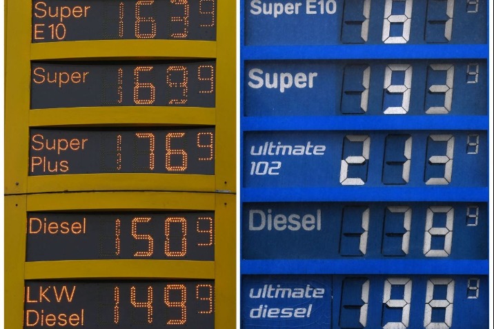 This combination of pictures created on Oct 14, 2021 shows differing prices of petrol and diesel displayed at service stations in Dortmund (L) and Schwerte, both in western Germany. [Photo/Agencies]