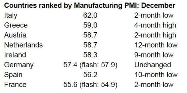 Eurozone PMI manufacturing was finalized at 58.0 in December, down from November’s 58.4. Markit said modest alleviation in supply pressures facilitated survey-record in crease in inventories. Broad sector growth growth continued to underwhelm while inflationary pressures receded slightly.