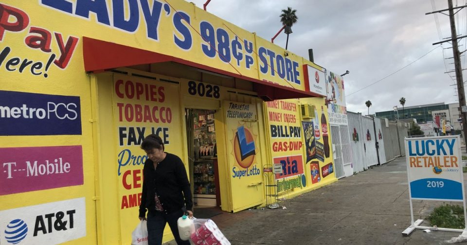 Inside the Glady’s 98 Cent and Up Store in South Los Angeles, residents made their way down narrow aisles, grabbing canned food and toilet paper. Handbags, backpacks and blankets hung from the ceiling, largely untouched. Behind a plexiglass wall, wearing latex gloves, Gladys Colchado, the store owner, rang up customers.
