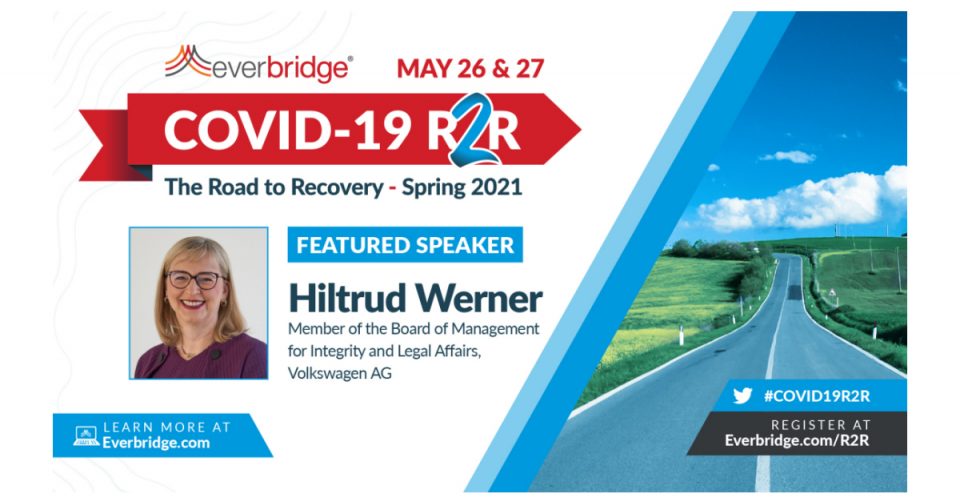 BURLINGTON, Mass.–()–Everbridge, Inc. (NASDAQ: EVBG), the global leader in critical event management (CEM), announced that Hiltrud Werner, Volkswagen Group Board of Management Member for Integrity and Legal Affairs, will speak today at its Spring 2021 COVID-19: Road to Recovery (R2R) virtual leadership summit taking place May 26-27, discussing compliance and risk management in a post-pandemic world.
