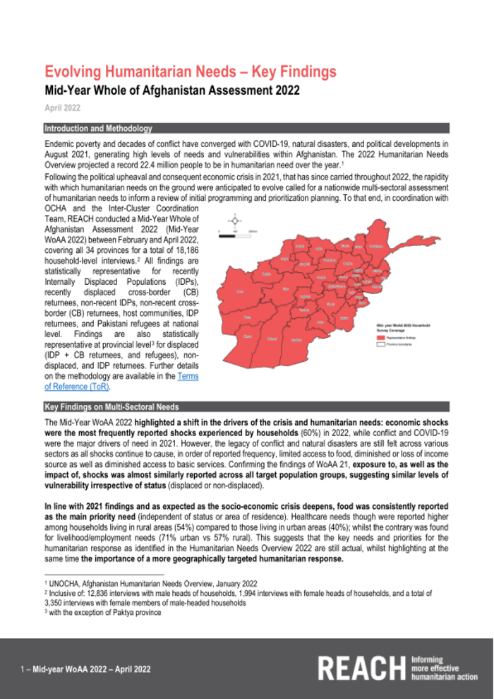 Endemic poverty and decades of conflict have converged with COVID-19, natural disasters, and political developments in August 2021, generating high levels of needs and vulnerabilities within Afghanistan. The 2022 Humanitarian Needs Overview projected a record 22.4 million people to be in humanitarian need over the year.1 Following the political upheaval and consequent economic crisis in 2021, that has since carried throughout 2022, the rapidity with which humanitarian needs on the ground were anticipated to evolve called for a nationwide multi-sectoral assessment of humanitarian needs to inform a review of initial programming and prioritization planning. To that end, in coordination with OCHA and the Inter-Cluster Coordination Team, REACH conducted a Mid-Year Whole of Afghanistan Assessment 2022 (Mid-Year WoAA 2022) between February and April 2022, covering all 34 provinces for a total of 18,186 household-level interviews.2 All findings are statistically representative for recently Internally Displaced Populations (IDPs), recently displaced cross-border (CB) returnees, non-recent IDPs, non-recent crossborder (CB) returnees, host communities, IDP returnees, and Pakistani refugees at national level. Findings are also statistically representative at provincial level3 for displaced (IDP + CB returnees, and refugees), nondisplaced, and IDP returnees. Further details on the methodology are available in the Terms of Reference (ToR).