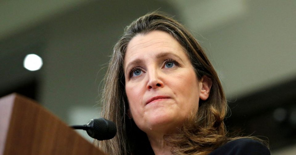 Canada’s Deputy Prime Minister and Minister of Finance Chrystia Freeland speaks at a press conference in Ottawa, Ontario, Canada, February 17, 2022. REUTERS/Patrick Doyle/File Photo