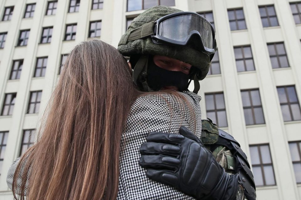 MINSK, BELARUS – AUGUST 14, 2020: A woman and a Belarusian law enforcement officer embrace in … [+]