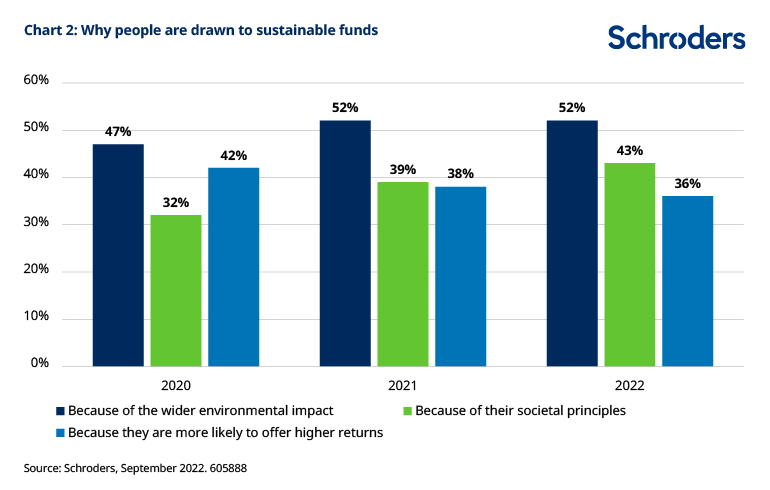 Specifically, the study found that environmental impact was the main reason people are attracted to sustainable investing. However, investing according to social issueshas grown in importance compared with previous years (selected as a driver by 43%, compared to 39% in 2021 and 32% in 2020).