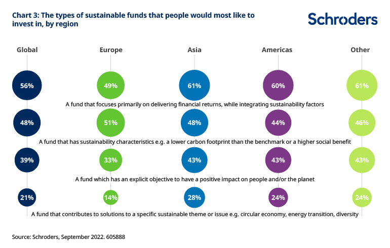 That is particularly the case for people in Asia (61%) and the Americas (60%), while people in Europe were more likely to choose a fund with sustainability characteristics (51%).