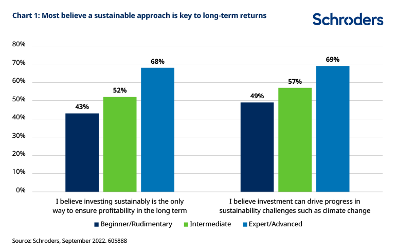 “Expert” investors are more likely to believe that investing sustainably is key to driving long-term returns compared with their peers who rate themselves as less knowledgeable, research by Schroders has found.