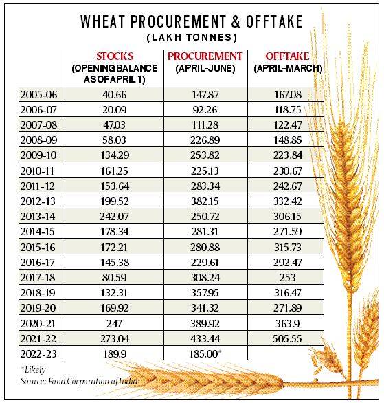 With opening stocks of 19 mt and expected procurement of 18.5 mt, government agencies would have 37.5 mt of wheat available for 2022-23. Not all this, however, can be sold, as a minimum operational stock-cum-strategic reserve has to be maintained. The normative buffer or closing stock requirement for March 31 is 7.5 mt. Providing for that will leave 30 mt available for sale from government godowns this fiscal.