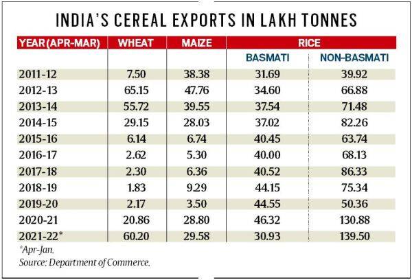 The same goes for rice, where non-basmati exports have touched 14 mt in April-January and surpassed the 13.1 mt record for the whole of 2020-21. “We should end up doing close to 17 mt of non-basmati and another 4 mt of basmati,” says Nitin Gupta, vice president of Olam Agro India Ltd, a leading exporter of the cereal. Even corn shipments are on course to reach 3.5-4 mt, levels last seen in 2013-14 (see table).