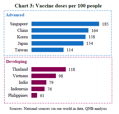 Second, the Delta variant hit ‘Factory Asia’ particularly hard during Q2 and Q3 of this year. The main reason was that the Delta variant is so much more infectious than the original virus. Fortunately, after a slow start, Asian countries have now made significant progress with vaccination campaigns. However, despite this progress there remains a clear divergence between countries, with advanced countries administering many more vaccine doses per hundred people than developing countries.