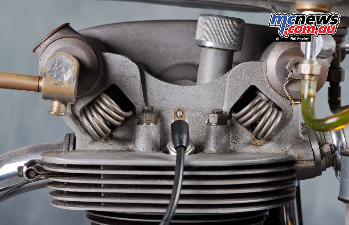 The 125 Bialbero used a short vertical shaft with bevel gears at both ends to drive the central gear of five overhead gears of which the outermost gears drove the camshafts. All these gears were on the right hand side of the motor. Bore and stroke was 53 x 56.4mm, with a dry sump and external flywheel employed.