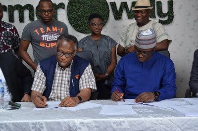 The Chairman, Best Foods L&P Limited, Mr. Emmanuel Ijewere and Founder and CEO of Farmcrowdy, Onyeka Akumah signing the acquisition deal at the Farmcrowdy office in Lagos, Nigeria. (PRNewsfoto/Farmcrowdy)