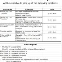 PLATTSBURGH — Clinton County Office for the Aging is excited to once again to distribute Farmers’ Market Coupons beginning July 18. Please see the schedule for a list of distribution sites and times.